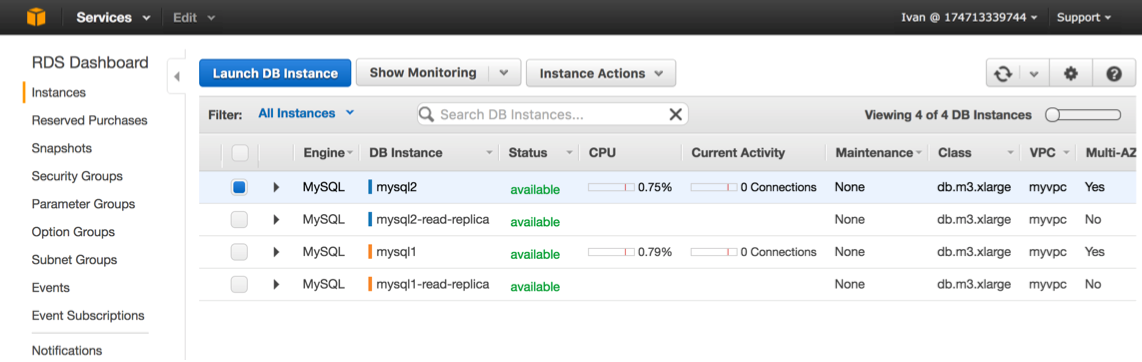 本例使用 MySQL 5.6.34 版本,开启 Multi-AZ 及自动备份功能,并且为每个 MySQL RDS实例创建一个读副本做读写分离