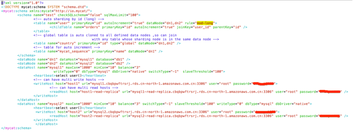 6. dataHost标签中的switchType为-1,意思是当writeHost故障的时候不进行切换,这是针对 RDS 特有的配置,由于 RDS 已经启用了 Multi-AZ 的功能,主库故障会自动切换到 standby 实例,无需 Mycat 切换到某台readHost