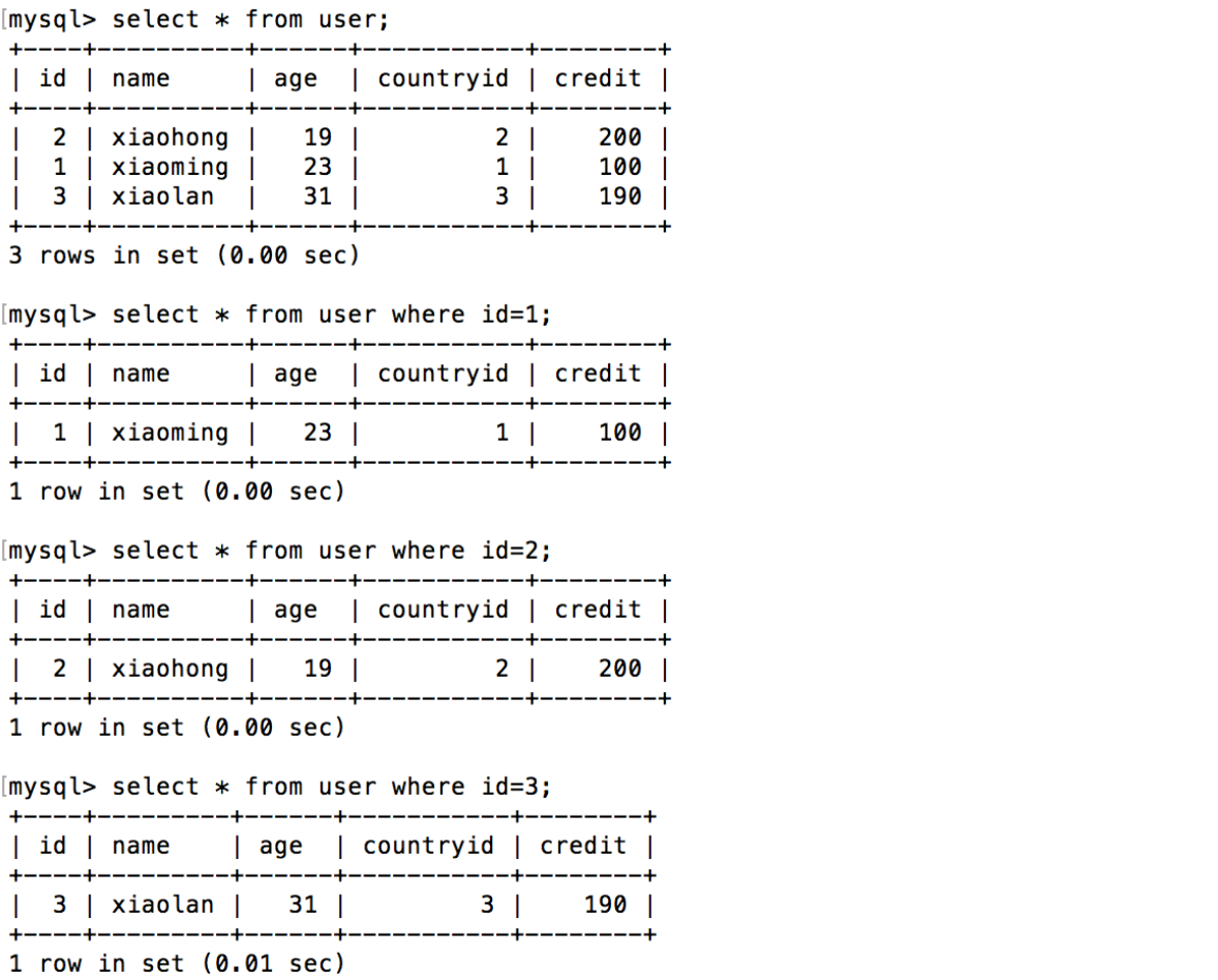 登入 Mycat,执行如下语句,可以看到在15:42:09-15:42:29的时间段内,一共执行了两次对 country 表的全表扫描,一次 user 表的全表扫描,和三次 user 表的单行查询,需要验证的结果如下: