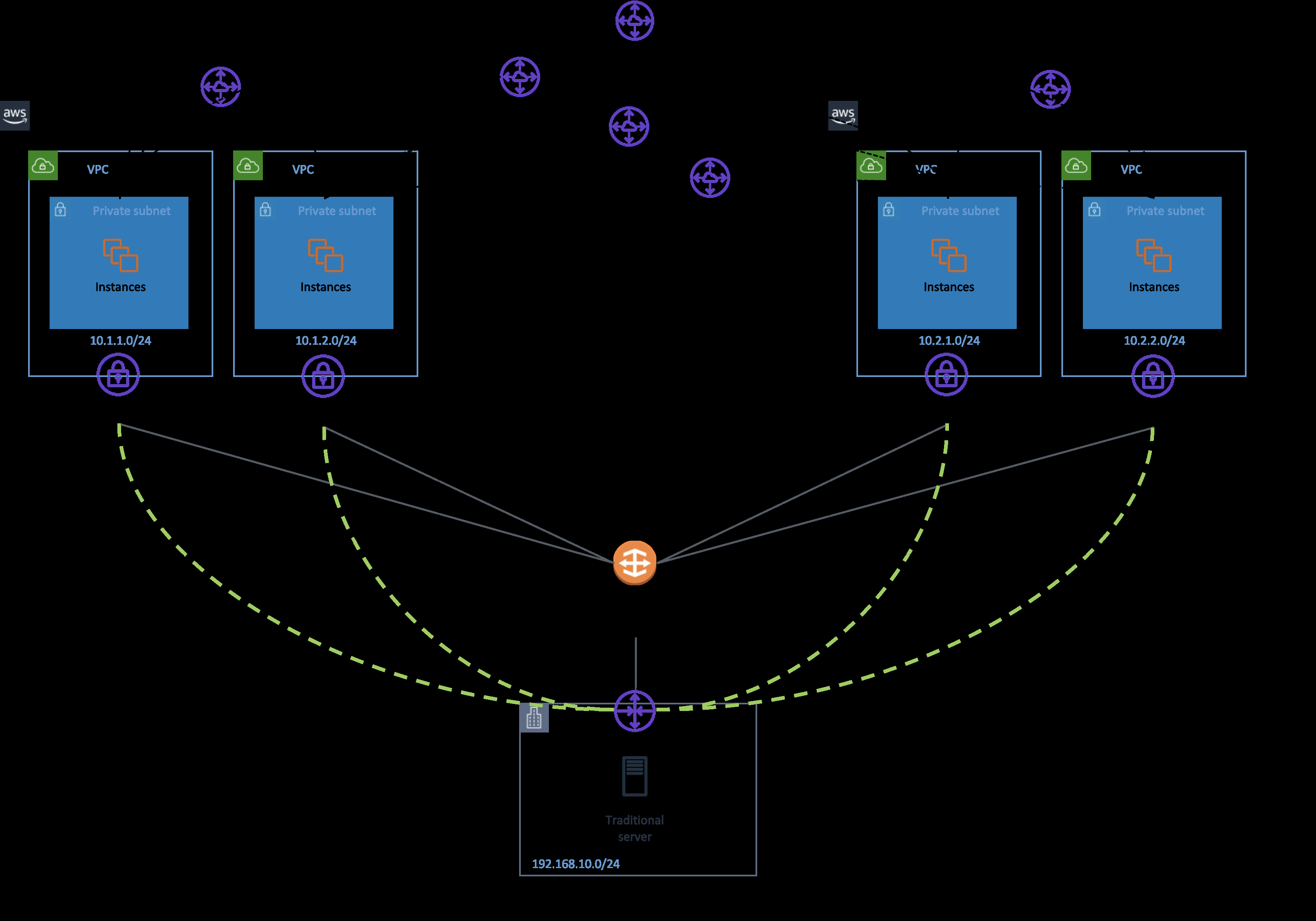 每一个 VPC 都需要单独建立一个 VPC Peering 到另一个 VPC,同时 Direct Connect Gateway 和 VPN 都需要单独建一个连接到每一个 VGW 上,非常复杂,管理起来也很混乱。