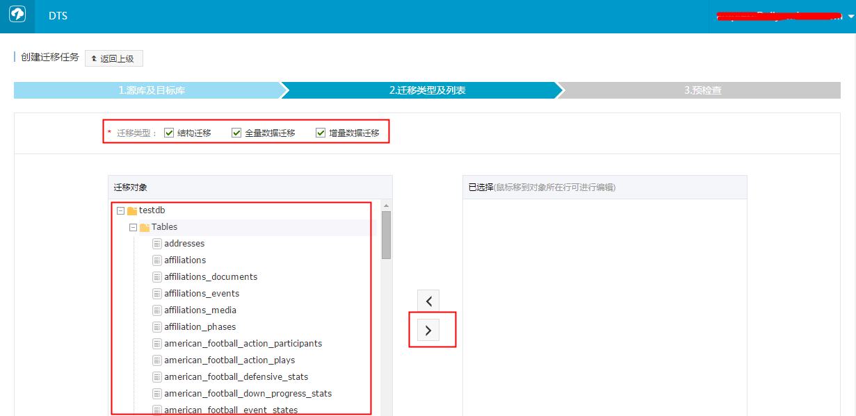 - 如果源库应用在迁移过程中有更新,那么可以选择进行增量数据迁移。在左边的迁移对象框中,选择需要迁移的对象,并拖动到右边的选择框中。