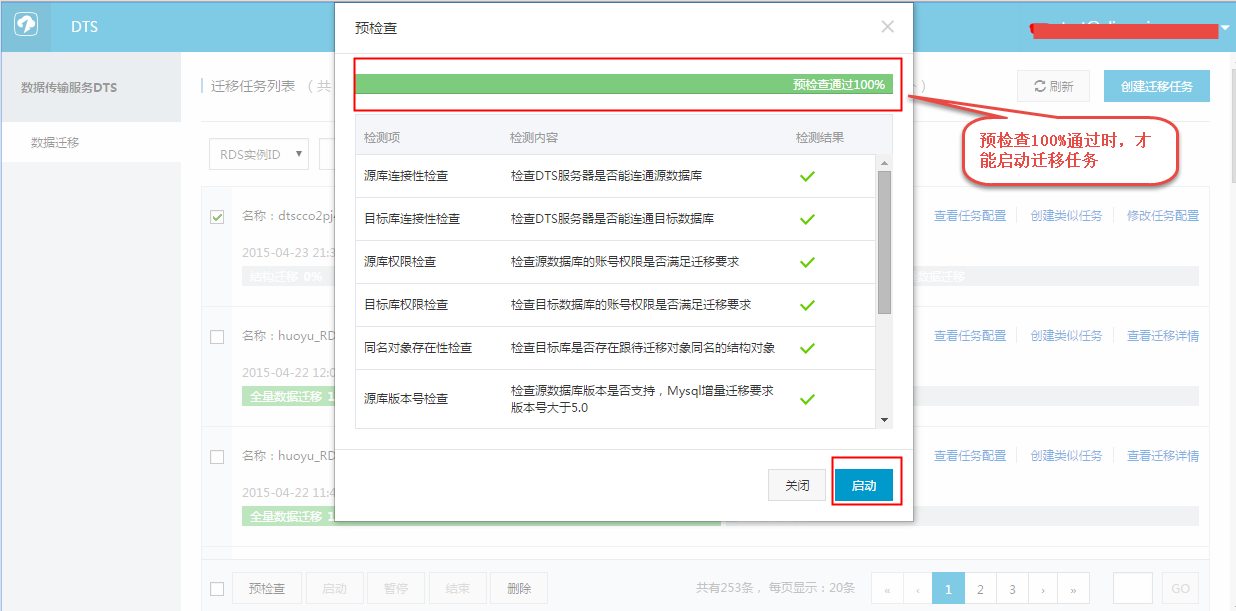 - 当预检查成功后,单击启动,任务即启动,可以在任务列表查看任务进度状态。如下图所示: